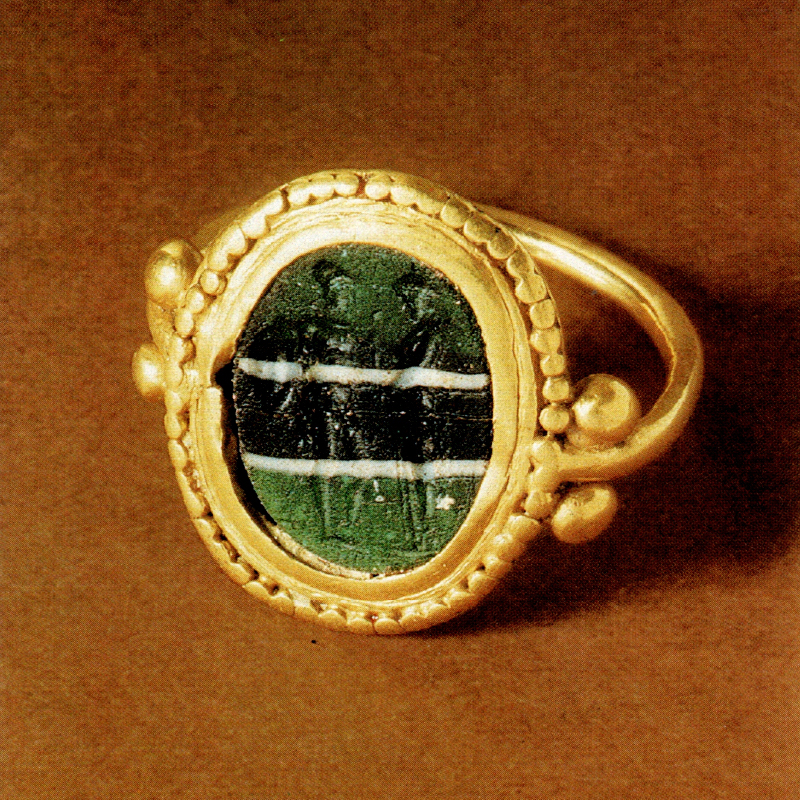 Anello con pasta vitrea raffigurante il “Commiato di un guerriero dalla propria sposa”,